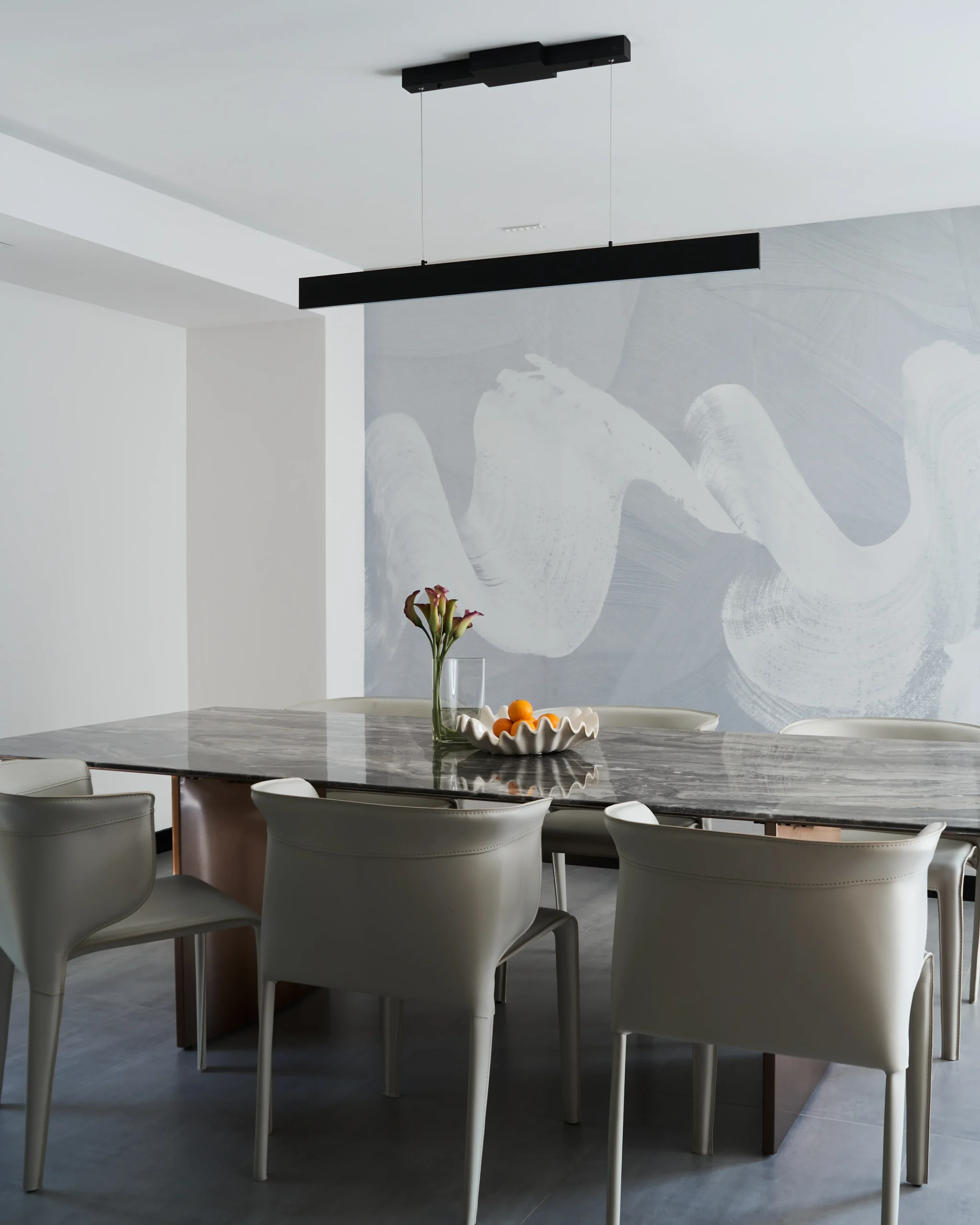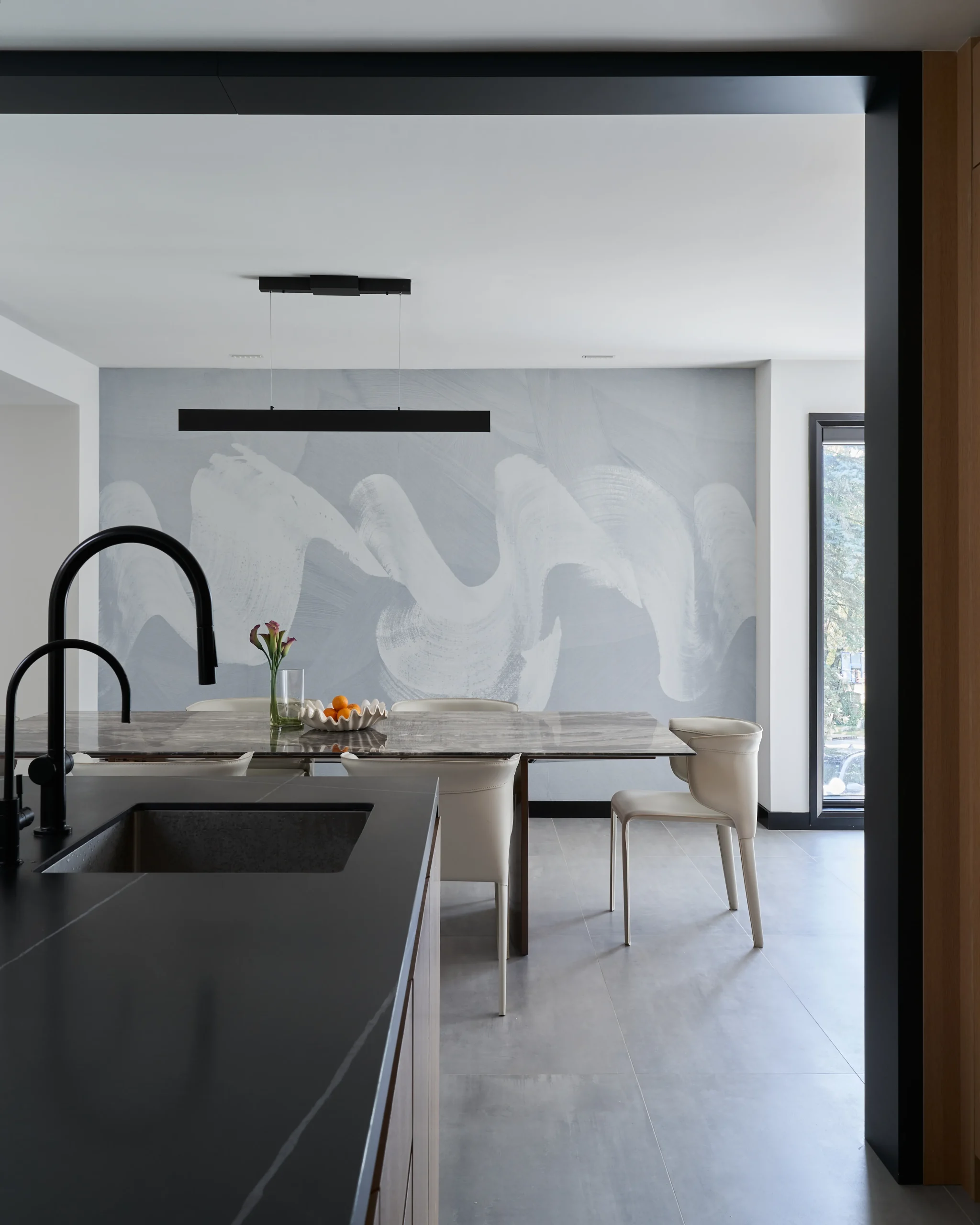 Pops of black punctuate the soothing white and grey tones throughout and look especially animated in the custom handles on concealed white doors. Wallpaper, a bold choice in a contemporary abode, makes the dining area and piano space come alive with abstract pattern and personality.