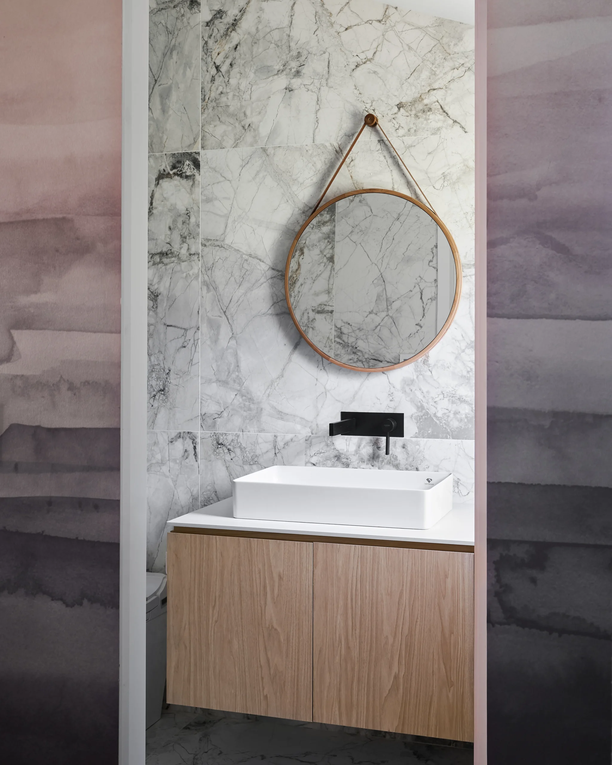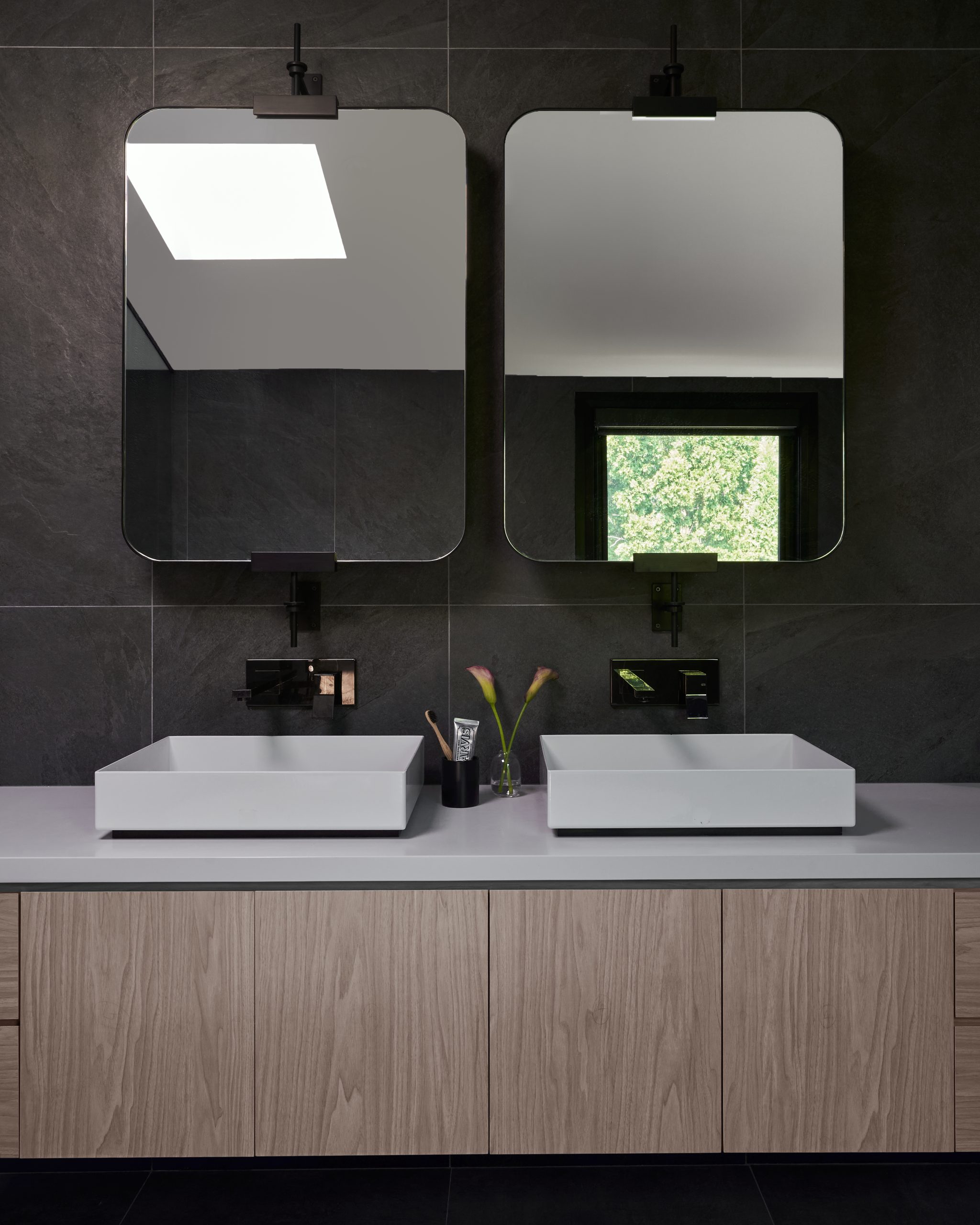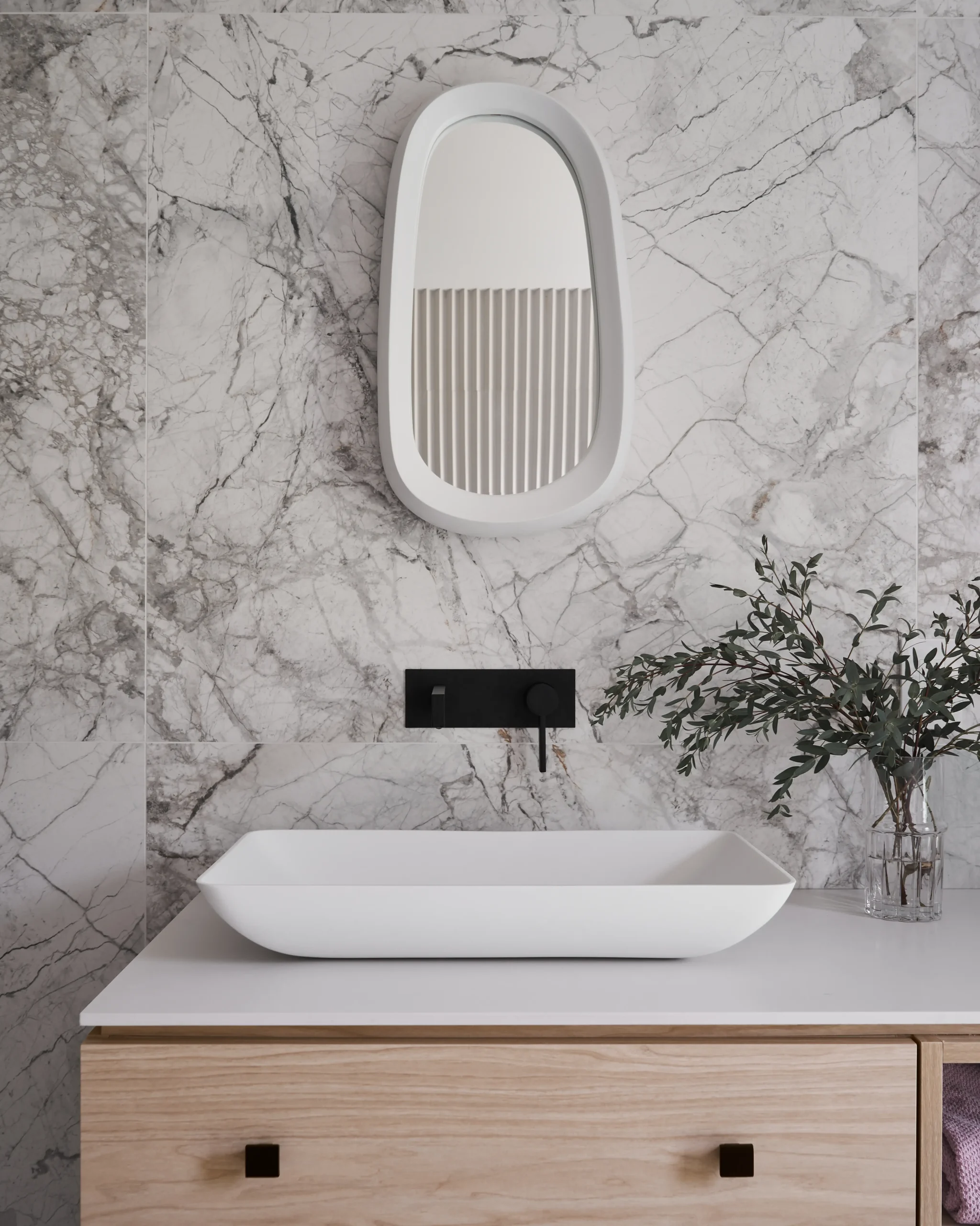 Bathrooms exude serenity with much natural light and sleek monochromatic palettes that have an organic quality. Details abound in all of them, and one mixes dramatically veined marble tiles with slim-line solid white styles for a further sense of depth and dimension.