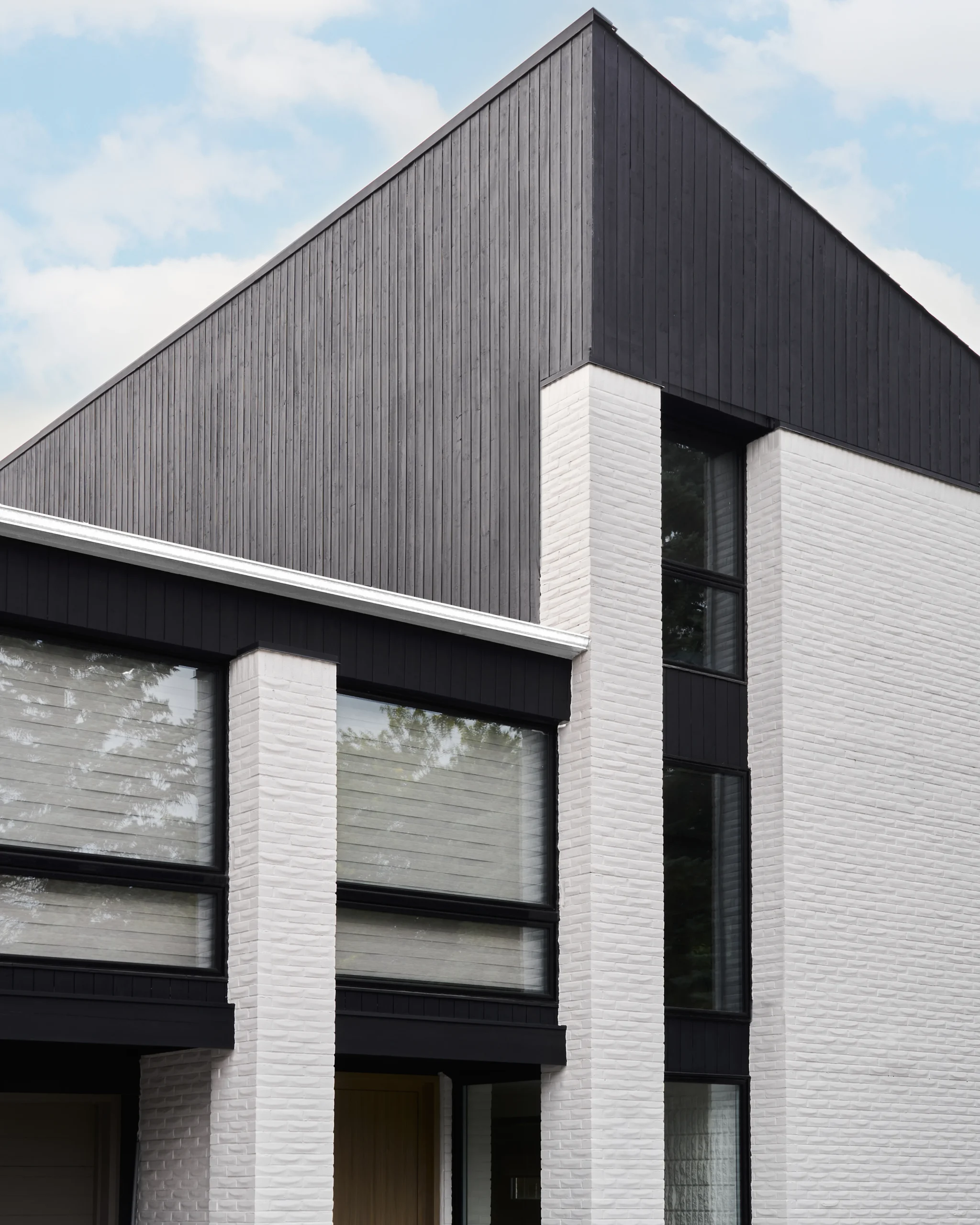 Preserving existing elements was key. The triangular roof structure remained intact, along with the exterior brick walls which extend to the interior. A restrained palette of soothing shades enriched the contemporary countenance of the space. Painting an interior double-height brick wall white factors in a crisp freshness, while adding decorative wooden beams to the ceiling layers in more visual interest and warmth.