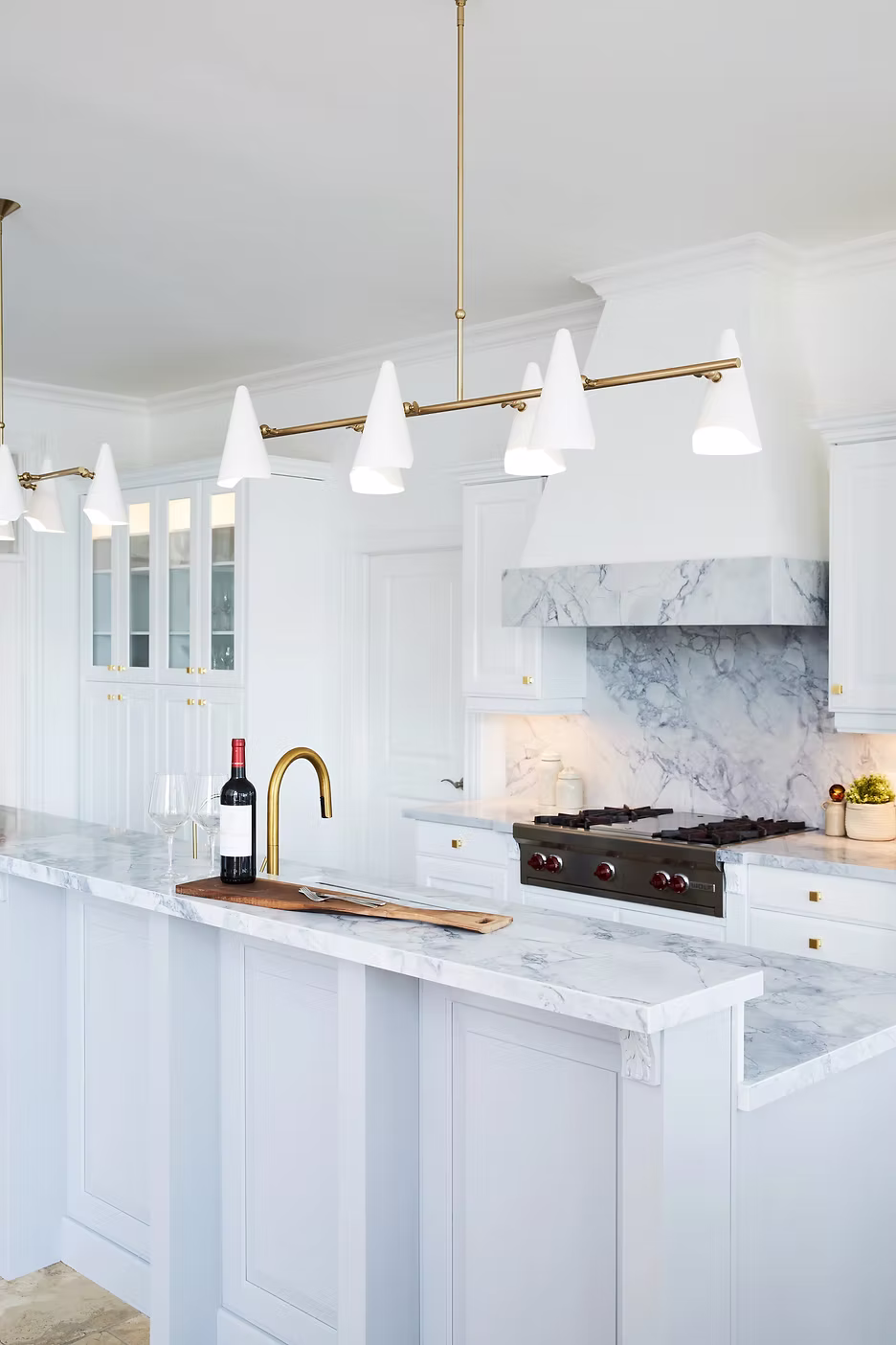 Subtle variations in color and texture bring vitality and interest to a classic white kitchen. While white kitchens are timeless, they can sometimes feel cold or unexciting. This kitchen, however, is anything but dull. By layering different colors, textures, and a mix of metals, the designer opted for white perimeter cabinetry and a grey island to create balance with the striking stone feature in this open-plan space.