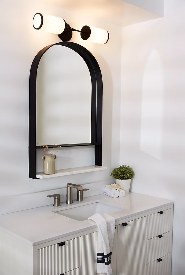 The black and white hue, create a sense of sophistication mirror, knobs and matching sconces finish off the look.