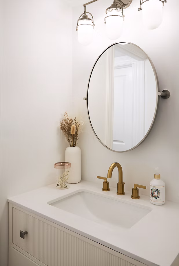 The white wall sconce and mirror, featuring a hand-finished plaster-like texture, create a simple yet striking statement that elevates the space.