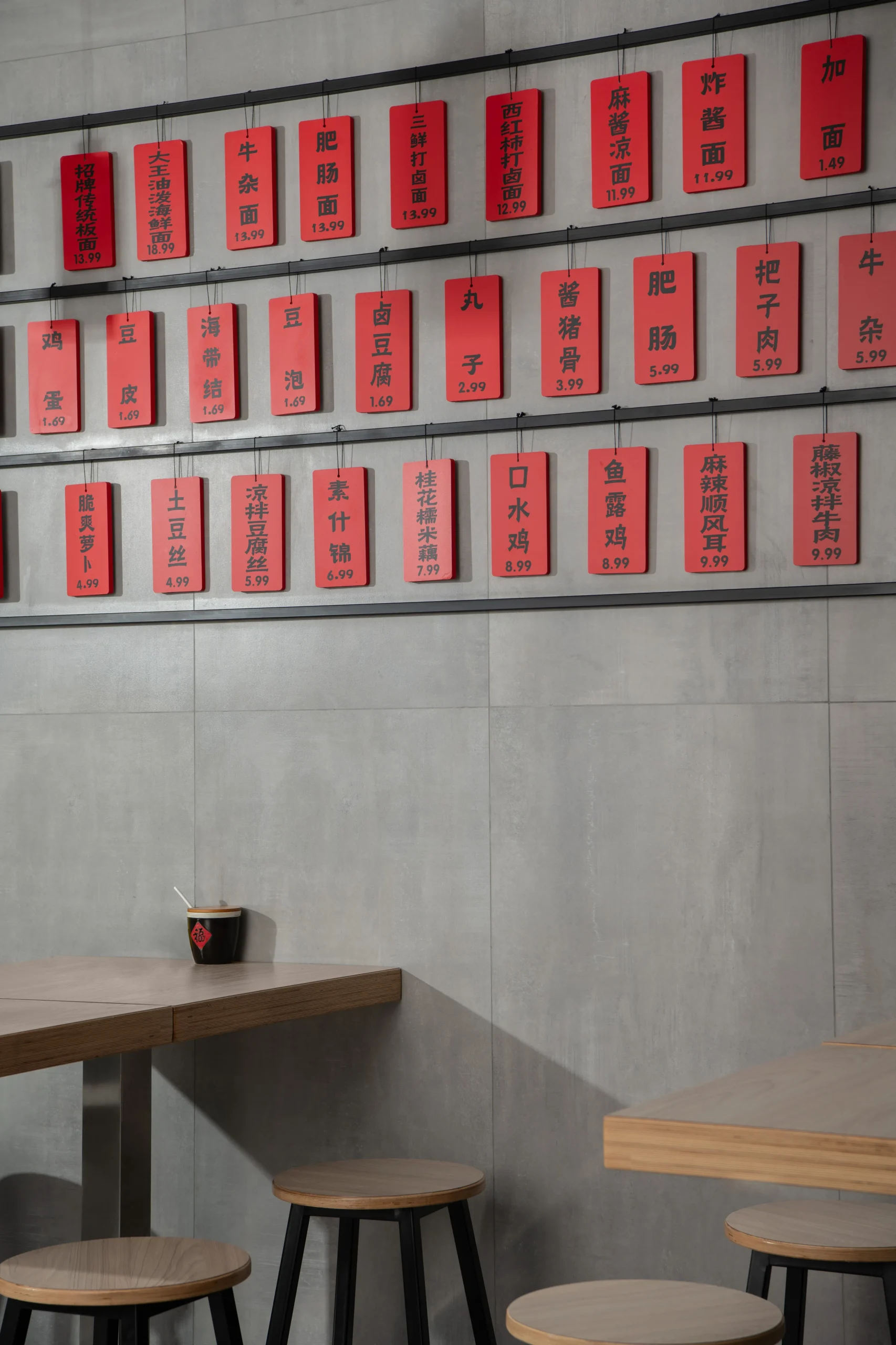 A stack of red plaques each with engrained words is a creative way of showcasing the restaurants menu. A strong bold “卤” Chinese character can also be seen at the cashier’s counter. With each delicate detail reflecting the designer’s interpretation and captures the very essence of what a contemporary Chinese eatery should look and feel.